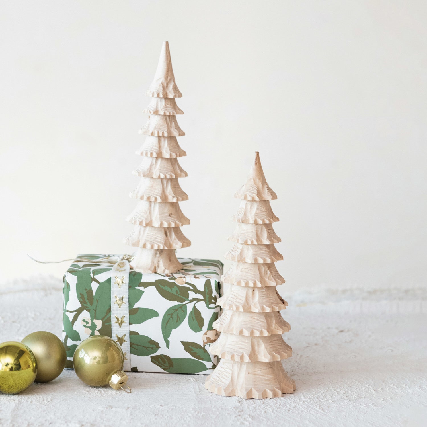 Spruce up your holiday decor with this natural, carved wood tree. Its rustic cone shape adds a touch of authenticity to your space. Easy to set up, this festive piece will bring joy to any room. Each sold separately